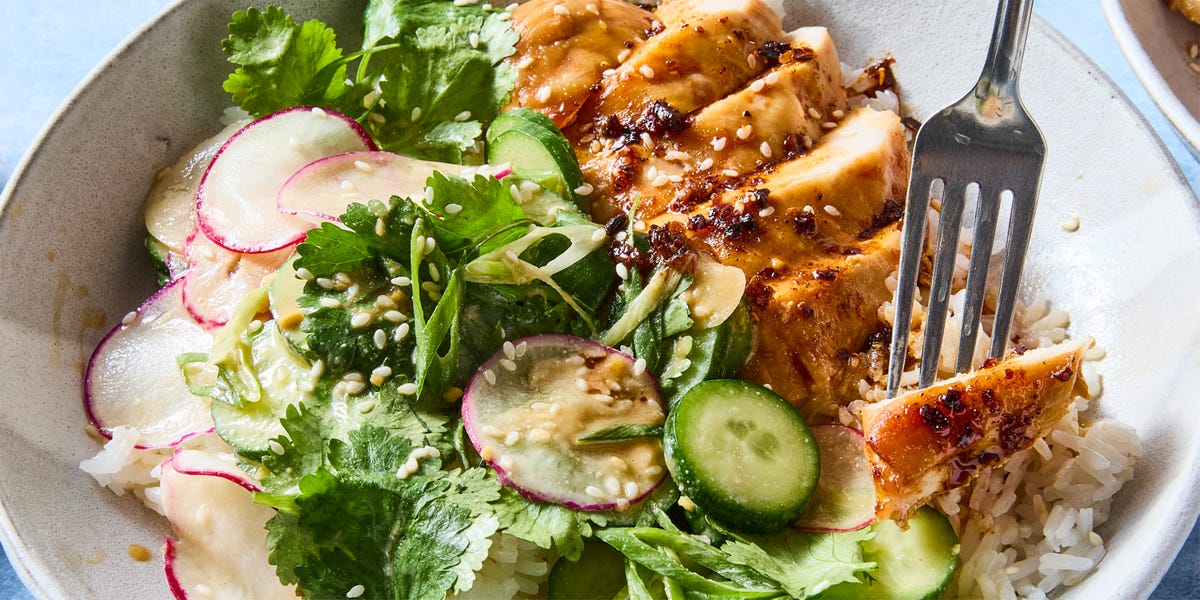This might just become your new favorite quick dinner recipe. I mean, who doesn’t love a good grain bowl? Separate components come together in perfect harmony, layering bold flavors and contrasting textures. Perfectly cooked, soy-kissed chicken thighs pair beautifully with a refreshing cucumber and radish salad, all topped with a creamy sesame-ginger sauce. Everything nestles on a bed of fluffy steamed rice, ready to soak up every last bit of saucy goodness.
