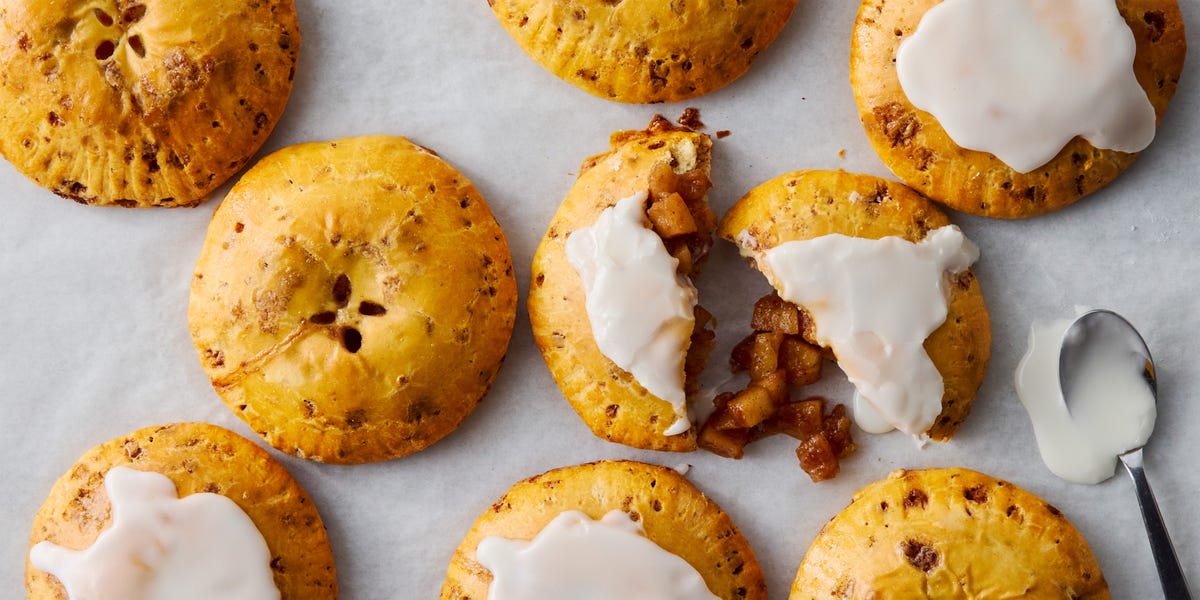 While there is nothing better than a warm, fresh-baked pastry, a leftover pastry is a close second. These baked hand pies can be stored in an airtight container in the refrigerator for up to 2 days. For best results, reheat them by placing them in a 350° oven for 10 minutes. Because it’s so simple—and a big part of that classic cinnamon roll feeling—you may want to make some extra fresh icing while they reheat.