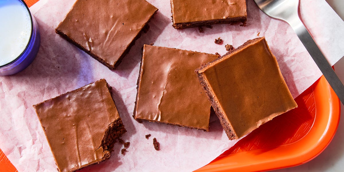 Lunch lady brownies are known for being topped with that shiny, smooth fudge frosting that crackles when cut. There’s nothing special about the frosting recipe: It’s made from simple pantry ingredients. The secret to getting that shiny, smooth top is spreading the frosting over the brownies while they’re still warm. This melts the sugar in the frosting, creating the glossy finish and crackling effect once the brownies have cooled and the sugar has recrystallized.