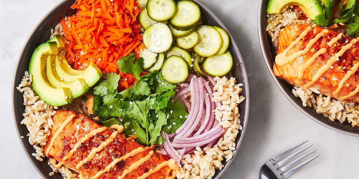 In this recipe, a brown rice base gets topped with baked salmon, pickled cucumbers, sliced avocado, shredded carrots, and red onion. Of course, feel free to top with whatever veggies you’ve got on hand. Forget ordering sushi—this spicy salmon bowl is our favorite way to enjoy all the same flavors in an easier (and versatile) way at home.