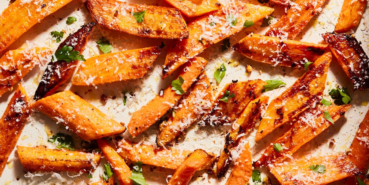 The real trick to this recipe is adding the Parmesan in two stages. First, you’ll toss the carrots with some cheese right before roasting, so it melts into the carrots as they turn tender. Then, once the carrots are out of the oven, you’ll add a little lemon juice, some fresh parsley, and even more Parmesan. It will not only give them an extra burst of cheese-y flavor, but they’ll be even prettier to present.