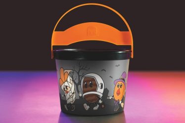 - Halloween Munchkins Bucket: Last year, Dunkin’ introduced the limited-time Halloween bucket that competes with McDonald’s Boo Bucket (and now, Burger King’s bucket, too.) that will be filled with a 50-count assortment of Munchkins Donut Hole Treats, including a new sprinkle-covered Halloween Munchkin. This time, Dunkin’s reusable trick-or-treating bucket is black and is topped with a purple Spider Donut-inspired lid as well as illustrations of Dunkin’ favorites in costume.