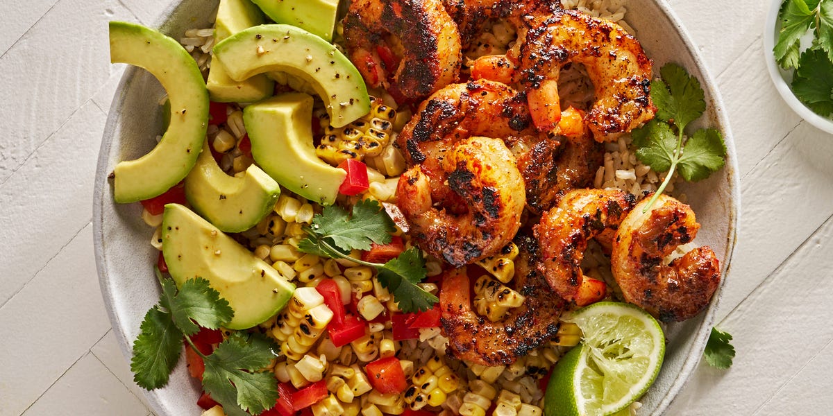 When I need a quick lunch or an ideal meal-prep formula, I turn to grain bowls. There are so many meal ideas I love, but these blackened shrimp bowls are my go-to when I’m in the mood for fresh and bright flavors (with a little bit of char). With seasoned, blackened shrimp, fresh veggies, fire-roasted corn, and a brown rice base, this bowl has it all. Filled with whole grains, protein, and fresh veg, these are the perfect bowls if you’re looking for an easy, healthy lunch or satisfying weeknight dinner to enjoy all year long—here’s everything you need to know to make them your own: