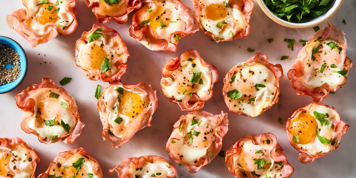 - Step 2Line each prepared cup with a slice of ham and sprinkle with cheddar. Crack an egg into each ham cup; season with salt and pepper.