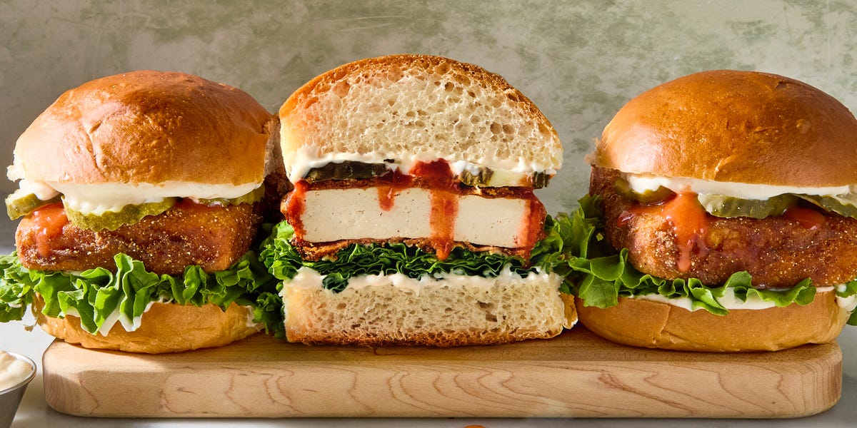 If you think tofu is boring, then clearly you haven’t tried this spicy fried “chicken” sandwich. In this vegetarian star, we replicated spicy fried chicken with protein-packed tofu and added cornmeal to the batter for extra crunch. Served with a homemade vegan garlic mayo, lettuce, and bread and butter pickles, this sandwich is crunchy, spicy, creamy, and tart; basically, it’s everything you could want in a meatless fried “chicken” sandwich.