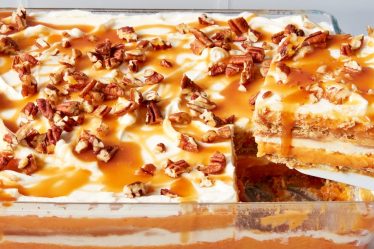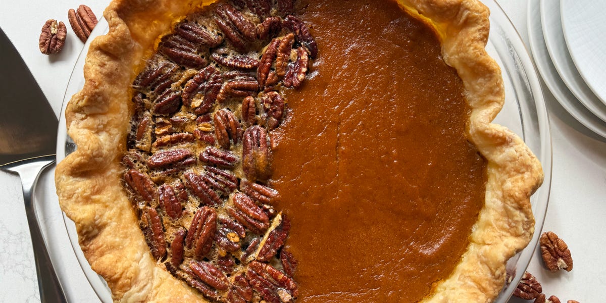 Can’t decide which kind of pie to make for Thanksgiving? No need to make a decision! You can make a split decision pie and make both a pumpkin and pecan pie in one. There is always so much food and so many Thanksgiving desserts that you don’t need two full pies. You can get the best of both worlds by making just one pie crust. You can easily cut a piece that includes a little of each type, or if a guest just prefers pumpkin, you can slice from that side. It makes decision-making so much easier. Both of the pies cook at relatively the same time, so it makes it easy to bake them together as one.