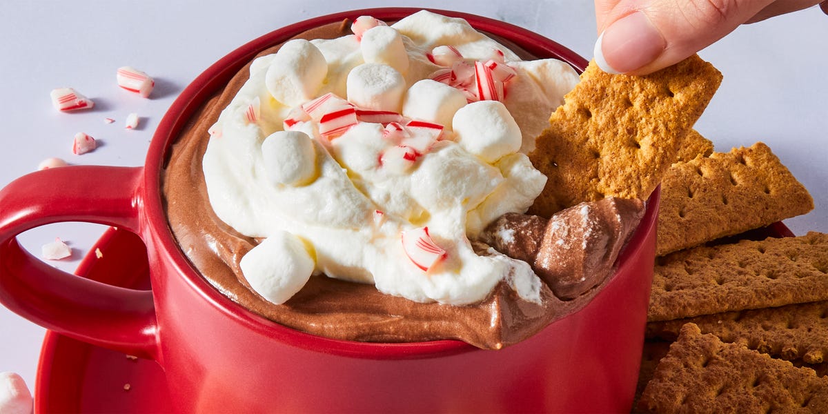 Folks of all ages can agree that, come the holidays, there’s just about nothing better than a steamy cup of hot chocolate. A cold day and a toasty mug, what could be better than that? Well, what if you could have your hot cocoa and eat it too? This sweet, creamy hot cocoa fluff is the perfect party dip that’s the best of both worlds. It has all the chocolatey, marshmallowy goodness of a cup of hot chocolate, plus it’s the perfect dip for all your favorite dippers—like graham crackers, cookies, and even strawberries. It’s topped with swoops of whipped cream, a shower of mini marshmallows, and sprinkles, if you’re feeling fancy.