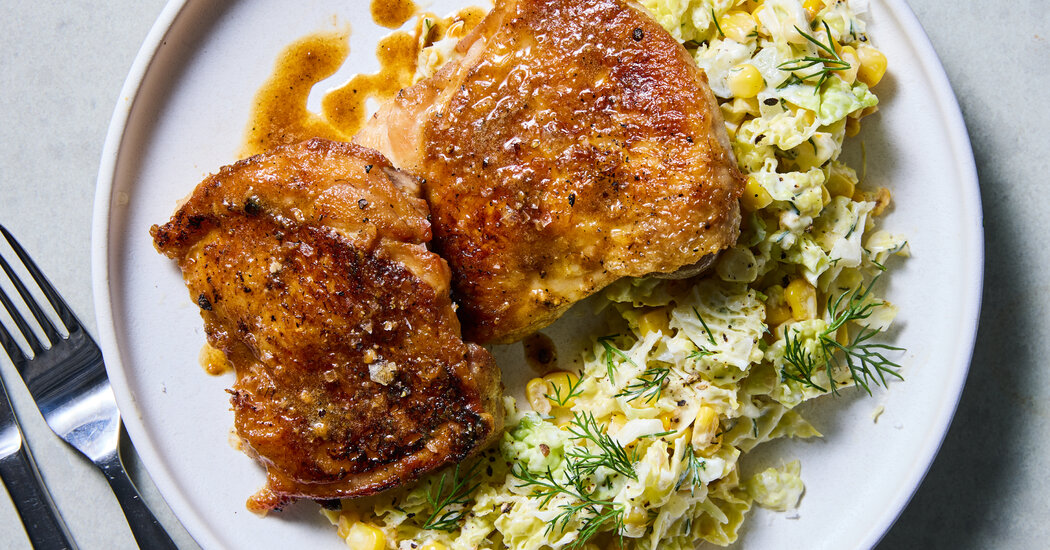 In this quick dinner, chicken thighs are pressed while they cook, ensuring even contact with the hot pan to encourage a crispy, golden crust. To take advantage of the browned bits left behind, a splash of hot sauce and water (or stock!) creates a spicy, zesty pan sauce in under a minute. A cooling salad of cabbage, corn and pickles with a ranch-style dressing makes a suitable partner for the rich chicken thighs.