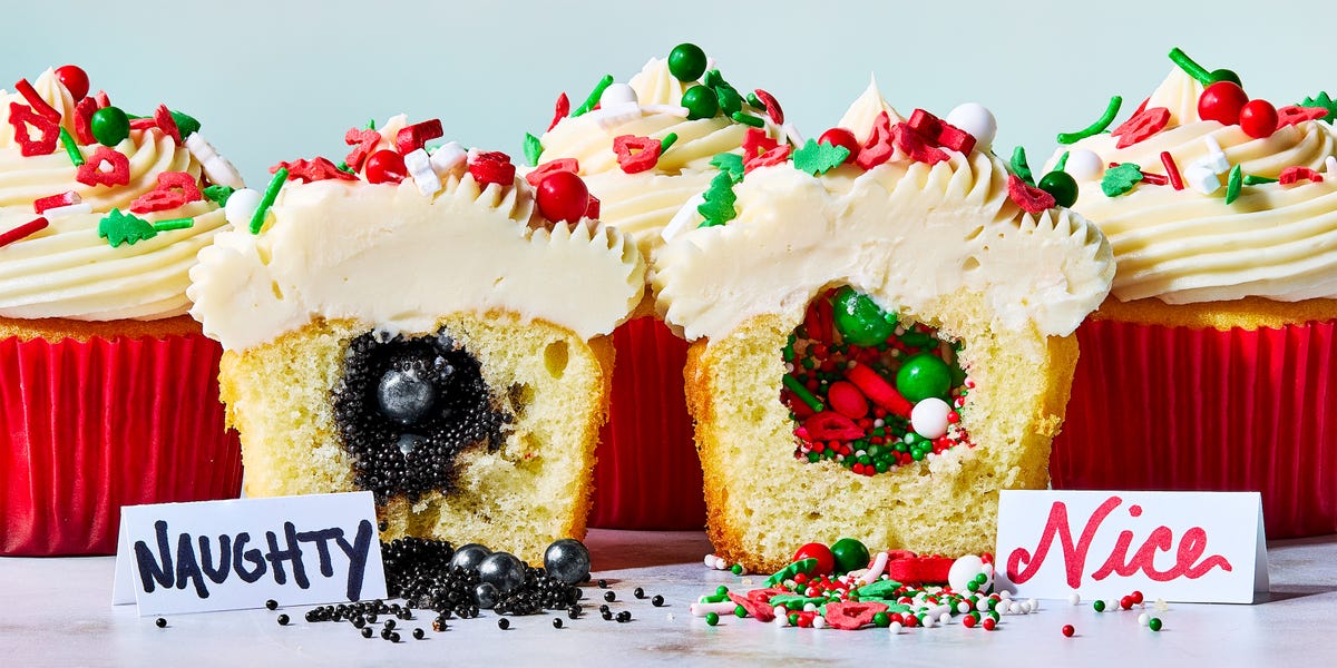 Have you been naughty or nice this year? Let these cupcakes decide! Inspired by the excitement of discovering whether you made the naughty or nice list, each cupcake is filled with a hidden surprise of either joyful colored sprinkles or mischievous black sugar sprinkles. Topped with fluffy vanilla buttercream frosting, these cupcakes not only taste heavenly, but are also a fun, interactive treat for holiday gatherings.