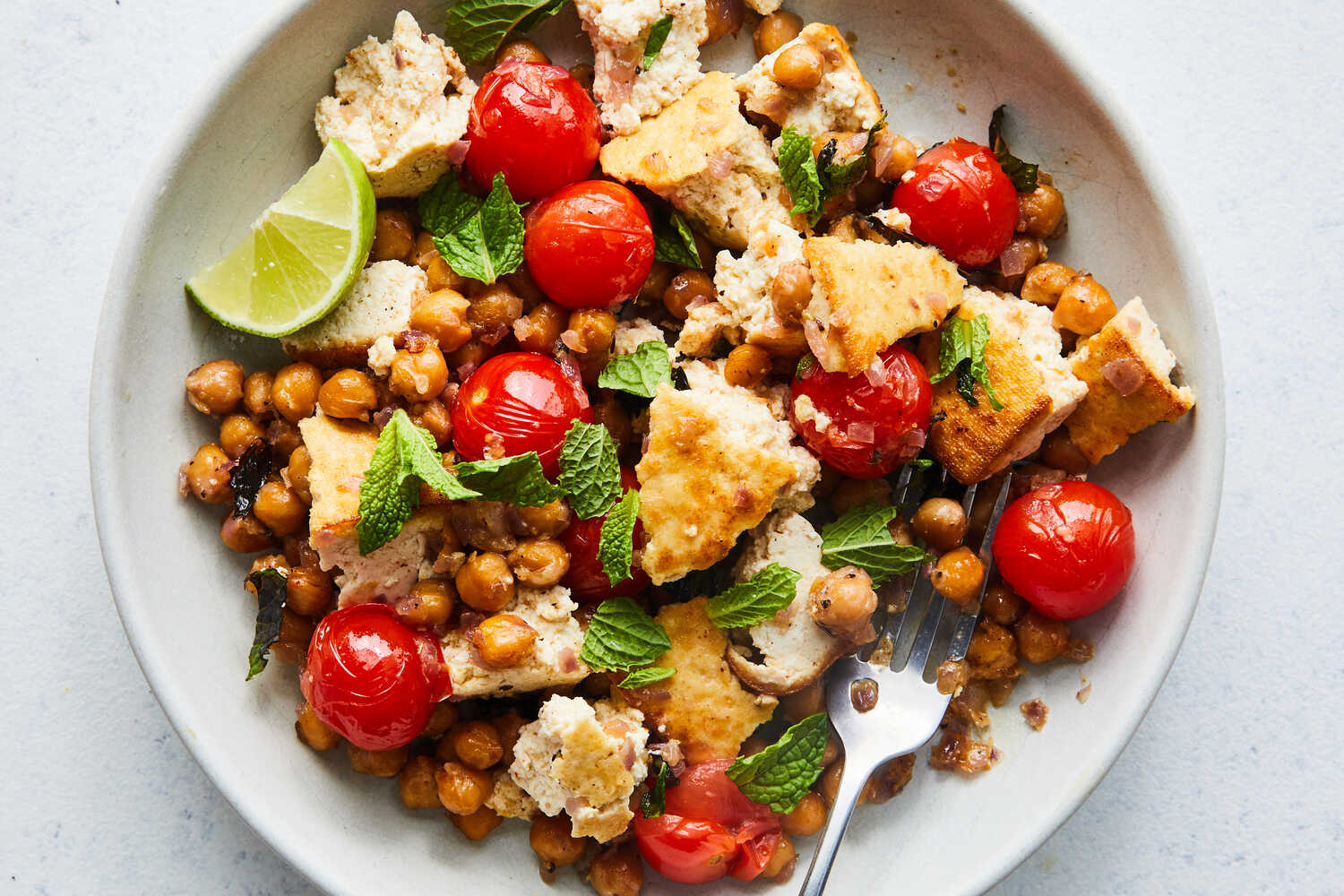 Like a warm and gentle nudge, masala spice gives onions and chickpeas a distinctively comforting heartiness. Glimmering with droplets of ghee, they become rich in this any-season dish. Tearing the tofu allows for ample crooks and crannies that cradle and accentuate the aromatic goodness of the spice. Cherry tomatoes, slightly and delicately blistered, are welcome as juicy bursts of acidity in every bite. Serve this over rice, or with a gently poached egg, along with a few slices of lime for squeezing.