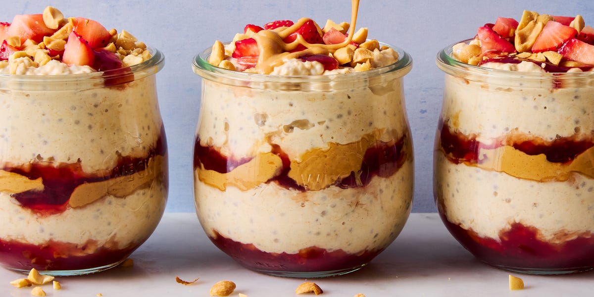 Overnight oats present endless opportunities to enjoy your favorite flavors for breakfast, but they’re also the perfect vehicle for extra protein. When I was brainstorming my ideal overnight oat flavors, I realized that peanut butter and jelly are an iconic duo that deserves more than being sandwiched between two slices of soggy white bread at lunchtime. With just a few minutes of prep, layers of strawberry jam and peanut butter protein oats get topped with chopped peanuts and strawberries to create a sweet and slightly salty combo that will jump-start your day and keep you full and focused until lunch.