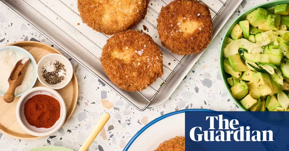 To cook the marrow schnitzels, place a cooling rack over an oven tray. In a high-side heavy based pan, heat a centimetre of oil over medium heat to 180C. You’ll know the oil is ready when a panko crumb turns golden in five to 10 seconds. In batches, fry the schnitzels to a deep golden brown on both sides, about three minutes per side. You want the marrow to cook through and soften a little, but it doesn’t need to be fully “cooked” like chicken. Transfer to a cooling rack to drain, and sprinkle with salt flakes like glitter.