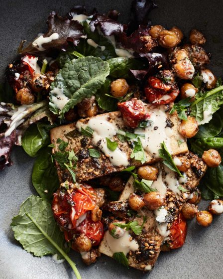 Tofu and chickpeas form the hearty base for vibrant, woodsy za’atar, the popular Middle Eastern spice blend. The tomatoes, when roasted, become acidic, little bursts in the salad, a great complement to the earthiness of the other ingredients. The roasted vegetables, chickpeas and tofu and the tahini dressing will keep for days once refrigerated. Assemble …