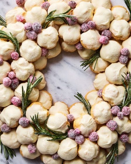 PHOTO: RACHEL VANNI; FOOD STYLING: CAITLIN HAUGHT BROWN Yields: 8 – 10 serving(s) SavePrint We love the success stories of our pull-apart breads and showstopping holiday desserts, like our Christmas tree croquembouche, so we’re turning the spotlight on a new Christmas dessert this year: a store-bought cream puff-turned-wreath. The excitement and ease of this recipe …